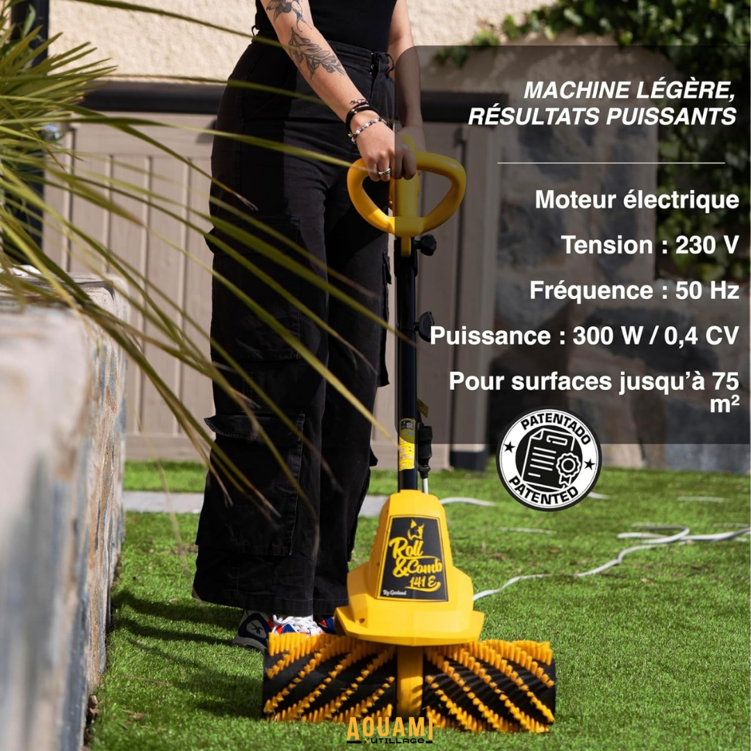 Cette brosse électrique pour gazon synthétique combine puissance, ergonomie et efficacité. Équipée d’un moteur électrique de 300 W, elle fonctionne à 230 V / 50 Hz et est capable de couvrir des surfaces allant jusqu’à 75 m² en un temps record.