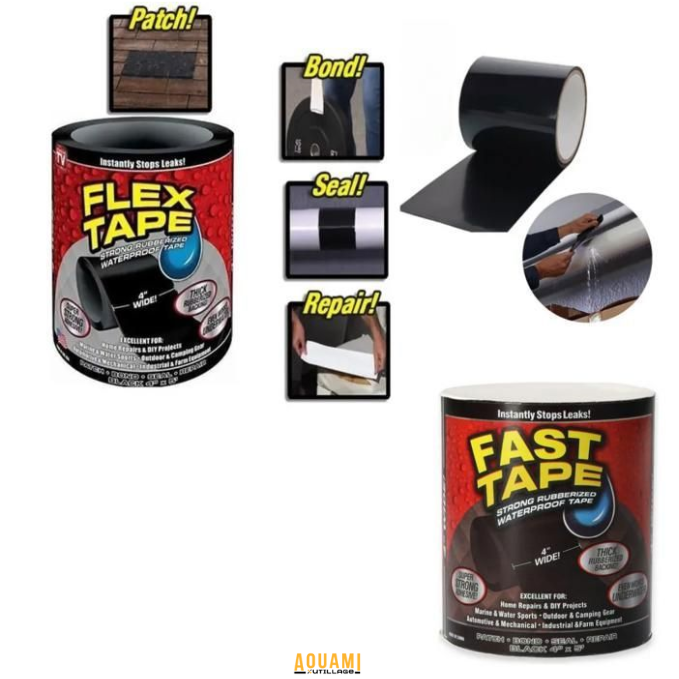 Le ruban résistant et étanche Flex Tape 10 cm (type Flex Tape) est la solution rapide et efficace pour colmater, réparer, sceller et protéger toutes les surfaces soumises à l’eau, à l’air et à l’humidité. Grâce à sa forte adhérence et à sa largeur de 10 cm, il offre une couverture optimale pour les réparations larges et difficiles.